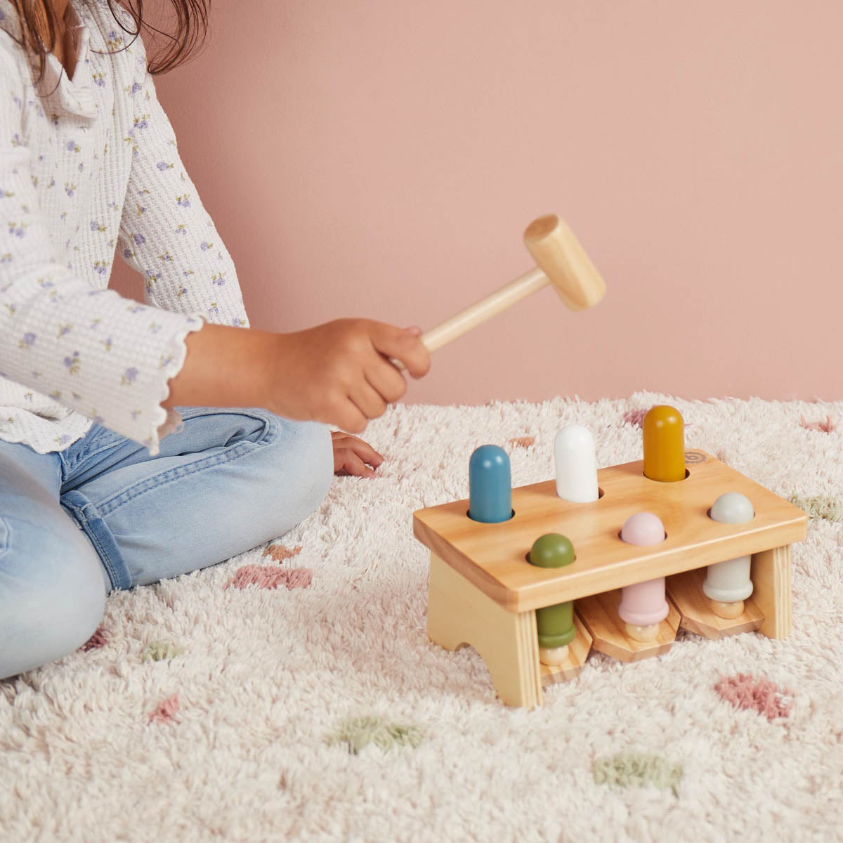 Écoutez qui frappe ! Avec un banc à tapoter, votre enfant peut développer sa motricité fine et sa coordination œil-main. En tapotant les chevilles en bois colorées avec le marteau, elles montent et descendent de manière amusante. C'est un jeu amusant et idéal pour reconnaître les relations de cause à effet.