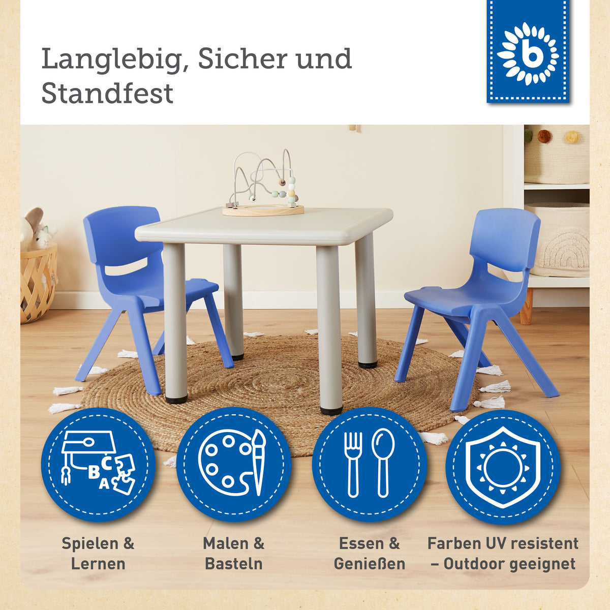 | Stable, confortable et facile d’entretien ! La chaise enfant pratique et élégante de Bieco est fabriquée en plastique de haute qualité, résistant aux intempéries, dans une jolie teinte bleue tendance.