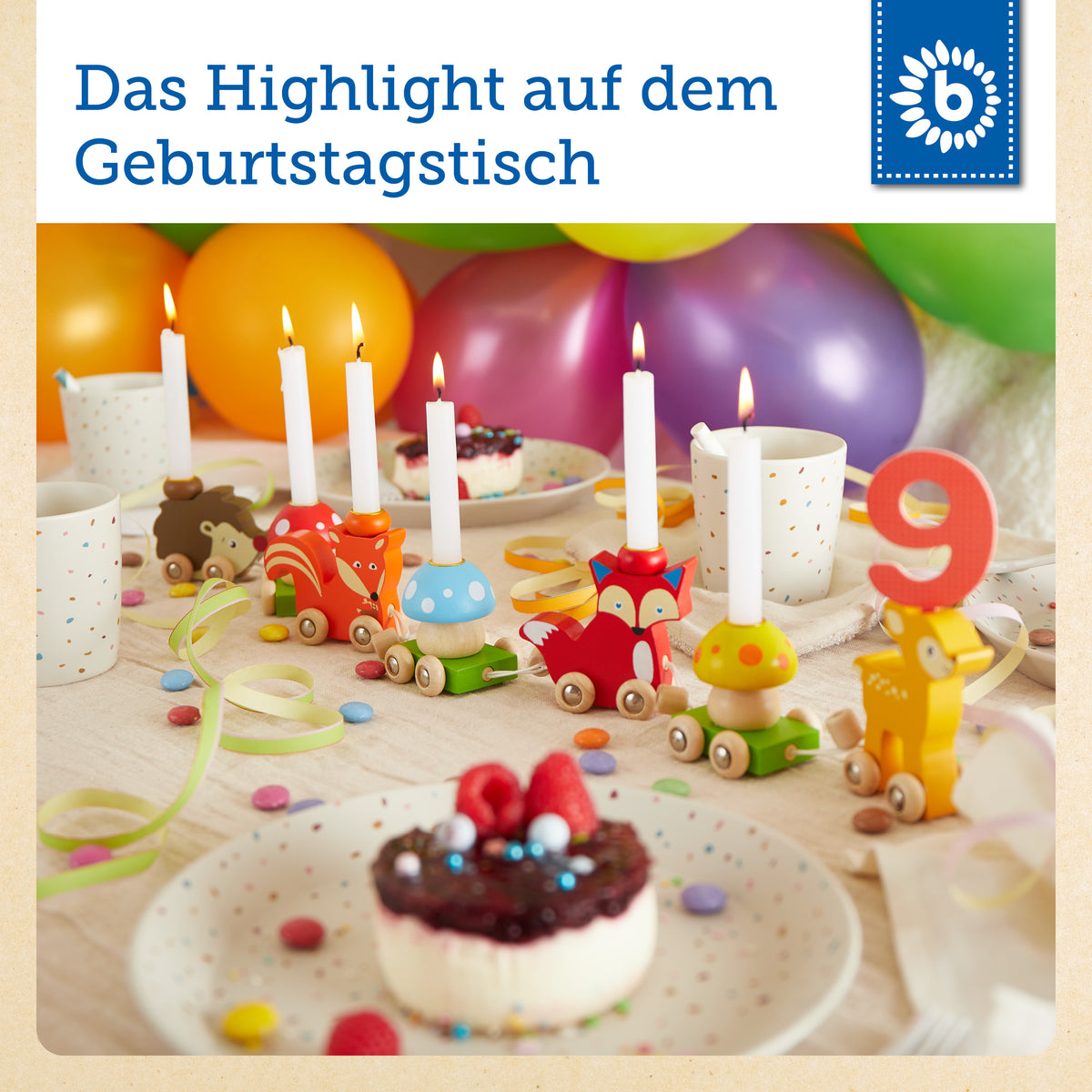 Avec le train d'anniversaire animaux de la forêt de Bieco, la table d’anniversaire devient le cœur de la fête, joliment décorée avec amour. De mignons animaux de la forêt comme le renard, le faon ou l’ours accompagnent ton enfant dans ses plus beaux moments d’anniversaire – année après année.