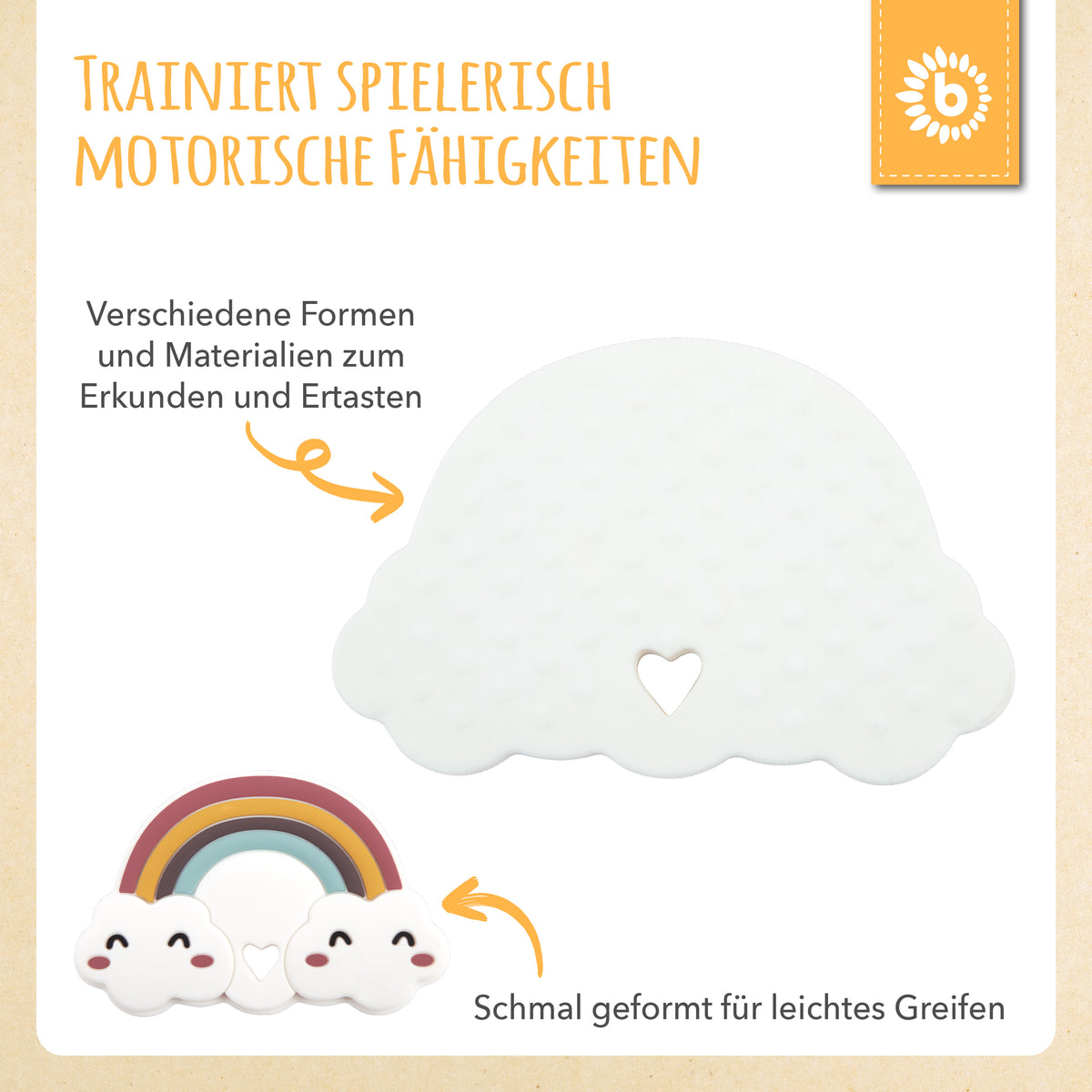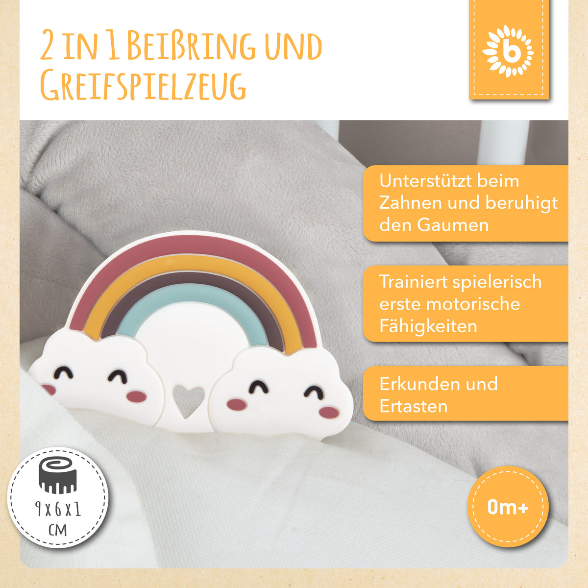 L’anello da dentizione in silicone di Bieco, nel grazioso design a nuvoletta, è il supporto perfetto durante la dentizione del tuo bambino. Il silicone morbido è particolarmente piacevole tra le manine del tuo piccolo tesoro e le diverse superfici invogliano a prendere, sentire e toccare. Come aiuto per la dentizione, rafforza il palato del tuo bebè, massaggia delicatamente le gengive e aiuta così ad alleviare il dolore da dentizione.