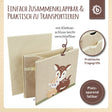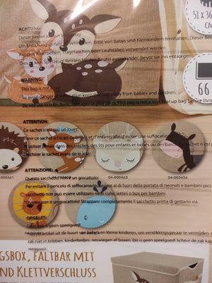 Questa bellissima box per giocattoli di Bieco porta ordine nella cameretta. La scatola decorativa ha un coperchio apribile che si chiude facilmente con una chiusura in velcro. Quando la box portaoggetti non serve, si può semplicemente piegare e riporre nell’armadio occupando pochissimo spazio. Grazie alle maniglie laterali, si trasporta con estrema facilità. Con una capienza di circa 65 litri, questa splendida box offre tanto spazio per i giochi preferiti, i vestiti e tante altre cose. Scopri anche le nostre altre box portaoggetti grandi e piccole per la cameretta, con altri dolcissimi motivi.