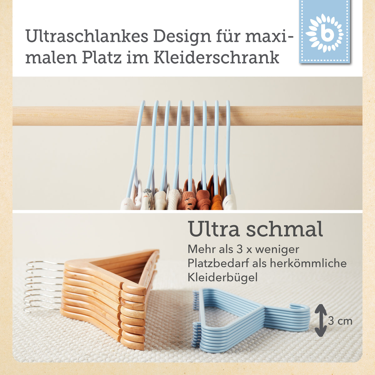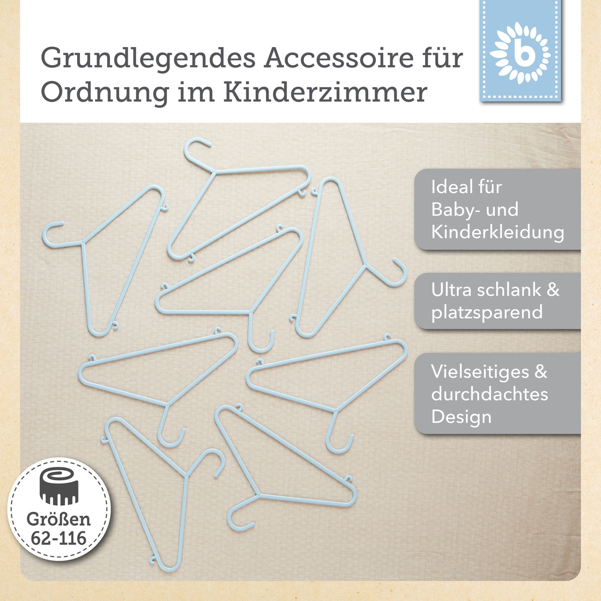 Metti ordine nell’armadio dei più piccoli: con le grucce per bambini extra piatte e leggere di Bieco, anche per i bimbi appendere giacche, maglioncini, vestitini e pantaloni diventa un piacere. Le grucce sono disponibili in tanti colori diversi e sono perfette per appendere i vestiti dei bambini o anche gli abitini delle bambole. Grazie alla barra per pantaloni e ai due ganci laterali, appendere i capi è davvero facilissimo. Realizzate in plastica di alta qualità, sono particolarmente leggere ma anche molto stabili. Per questo non sono solo un must have in ogni cameretta, ma sono ideali anche in viaggio: così è sempre tutto ben organizzato. Con una lunghezza di circa 30 cm, possono essere utilizzate a lungo per capi di diverse taglie.