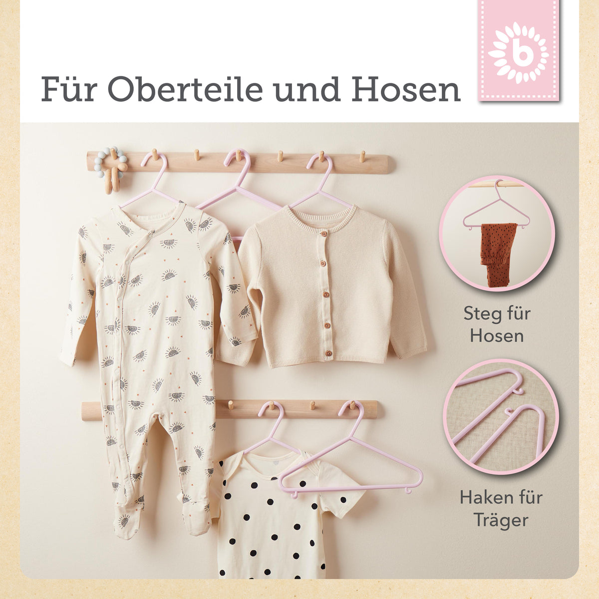 Metti ordine nell’armadio dei più piccoli: con le grucce per bebè extra piatte e leggere di Bieco, anche i bimbi si divertono ad appendere giacche, maglioncini, vestitini e pantaloni. Le grucce per bambini sono disponibili in tanti colori diversi e sono perfette per appendere i vestiti dei bimbi o anche gli abitini delle bambole. Grazie alla barra per pantaloni e ai due ganci laterali, appendere i capi diventa davvero facilissimo. Realizzate in plastica di alta qualità, sono particolarmente leggere ma molto stabili. Per questo non sono solo un must have in ogni cameretta, ma anche ideali da portare in viaggio: così è sempre tutto ben organizzato. Con una lunghezza di circa 30 cm, possono essere utilizzate a lungo per capi di diverse taglie.