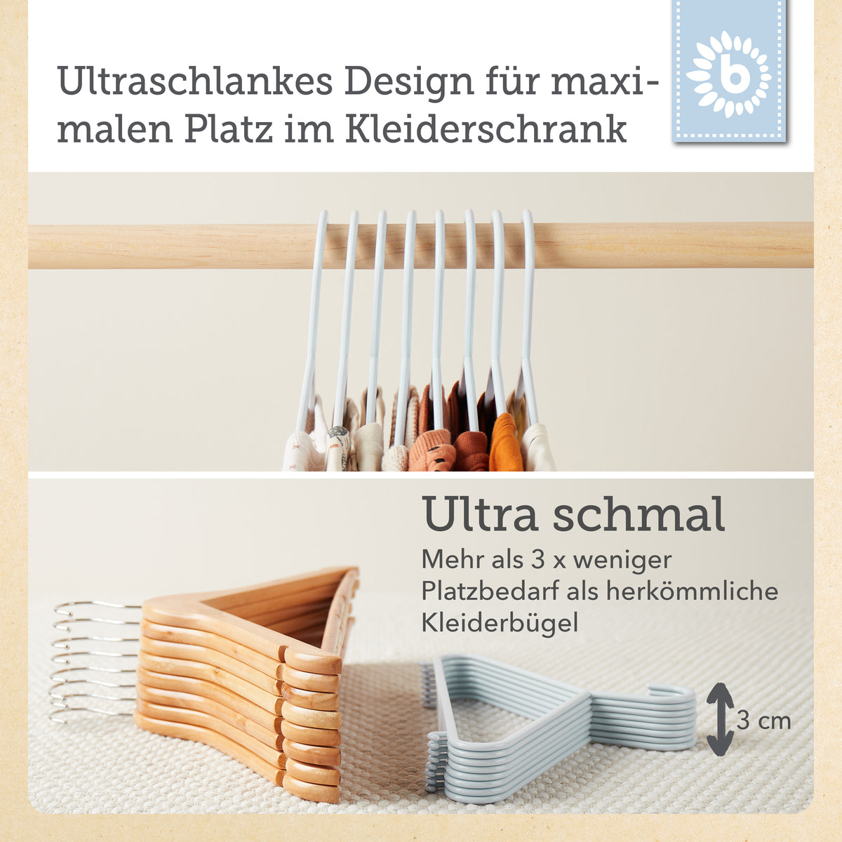 Metti ordine nell’armadio dei più piccoli: con le grucce per bebè extra piatte e leggere di Bieco, anche per i bimbi appendere giacche, maglioncini, vestitini e pantaloni diventa un gioco. Le grucce per bambini sono disponibili in tanti colori diversi e sono perfette per appendere i vestiti dei piccoli o anche quelli delle bambole. Grazie alla barra per pantaloni e ai due ganci laterali, appendere i capi è ancora più semplice. Realizzate in plastica di alta qualità, sono super leggere ma anche molto stabili. Per questo non sono solo un must-have in ogni cameretta, ma sono ideali anche in viaggio: così tutto resta sempre ben organizzato. Con una lunghezza di circa 30 cm, possono essere utilizzate a lungo per capi di diverse taglie.